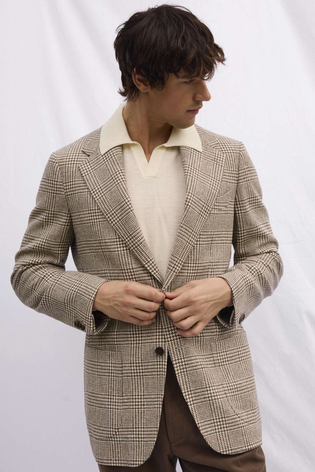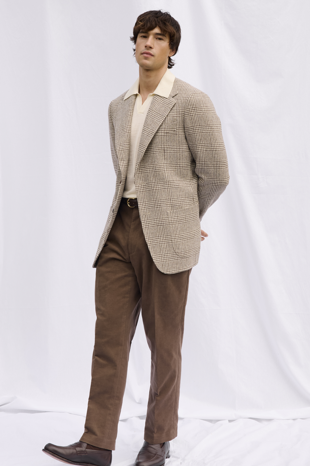 Brown and White Glen Check Wool Jacket, Ecru Knitted Polo Shirt, and Brown Moleskin Trousers