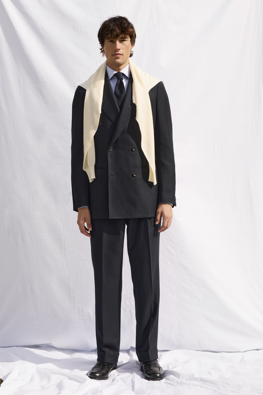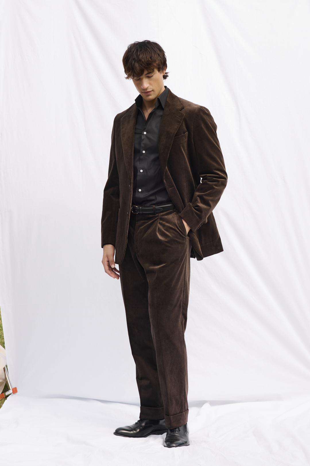 Brown Melange Hopsack Jacket, Brown Wool Shirt, and Off White Moleskin Trousers