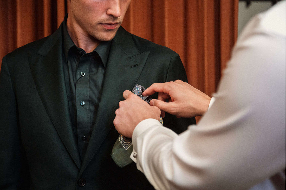 The trick with this style is gauging the right amount of fabric to leave hanging out. Whilst there are some who favour a slightly wilted effect with the pocket square ends drooping over the pocket, we recommend keeping them a little more trim to maintain an easy-going but crisp effect.