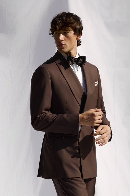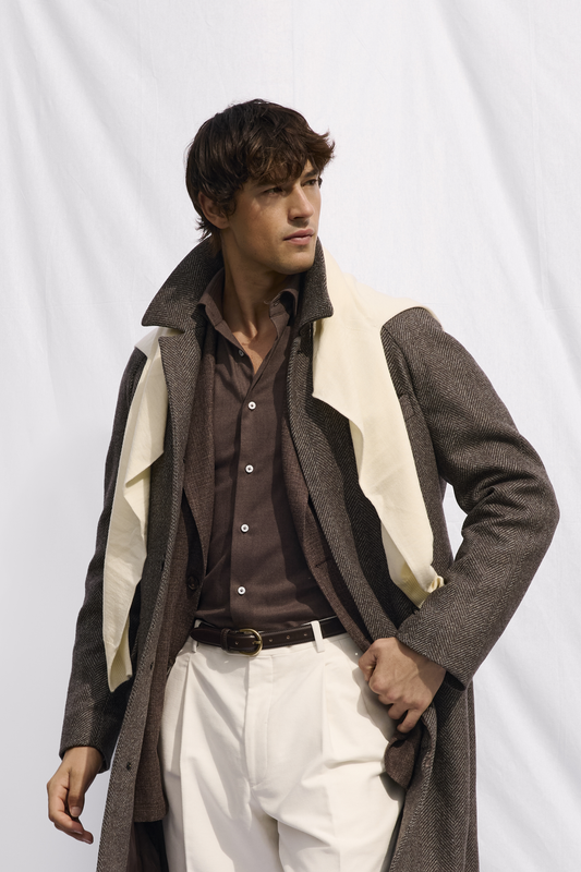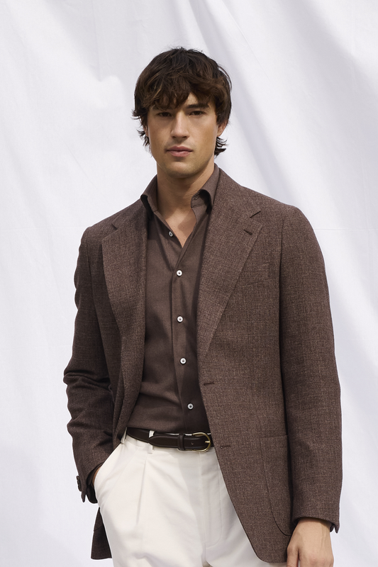 Brown Melange Hopsack Jacket, Brown Wool Shirt, and Off White Moleskin Trousers