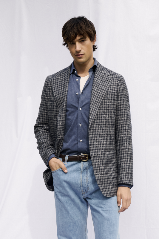Navy and Gray Houndstooth Jacket, Blue Melange Cotton Shirt, and Light Wash Jeans