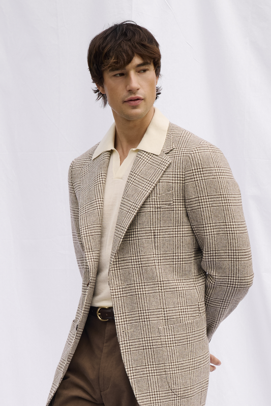 Brown and White Glen Check Wool Jacket, Ecru Knitted Polo Shirt, and Brown Moleskin Trousers
