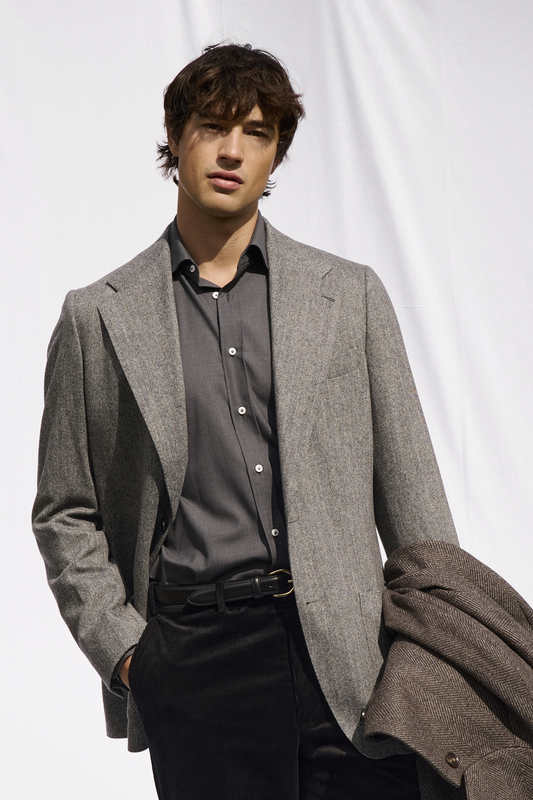 Charcoal Wool Cashmere Herringbone Jacket, Gray Wool Shirt, and Black Cord