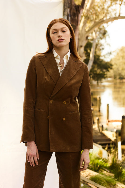 Tobacco Baby Cord Double Breasted Peak Lapel Suit