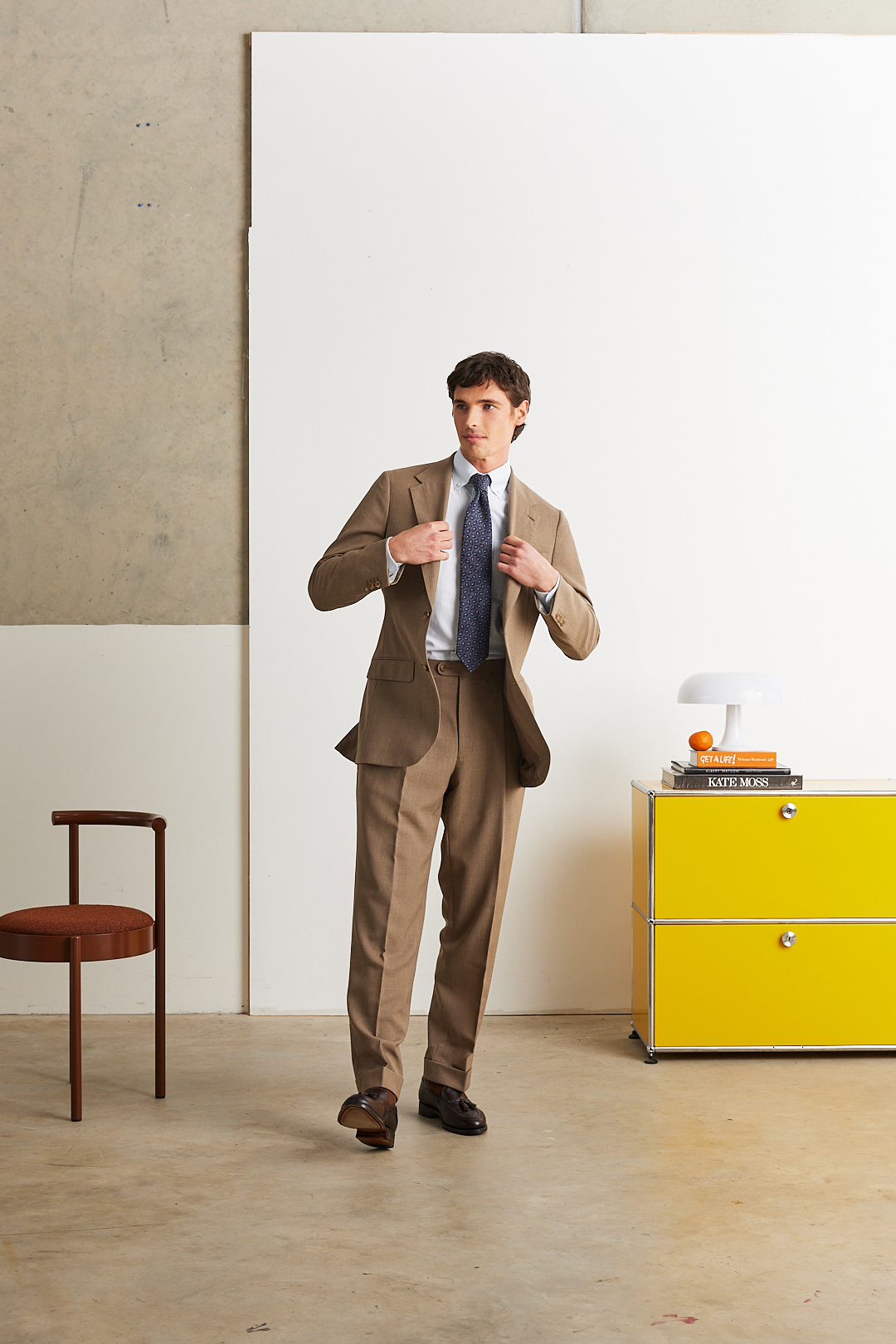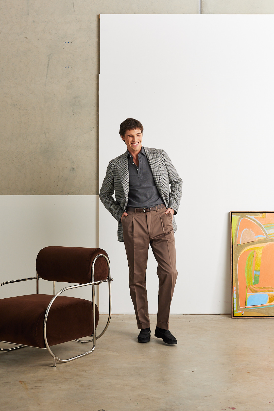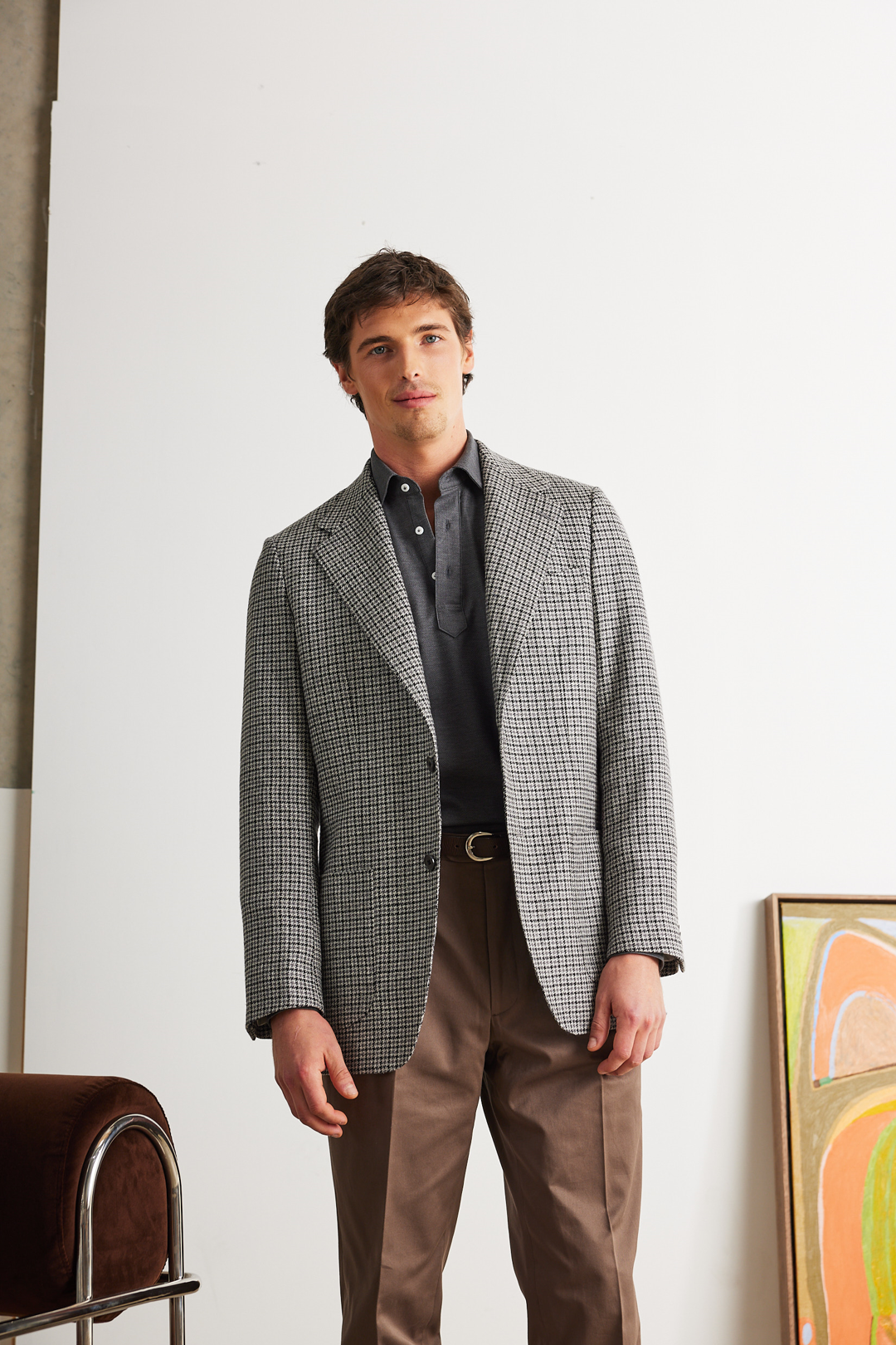 Charcoal Houndstooth Single Breasted Jacket and Taupe Brushed Cotton Chinos